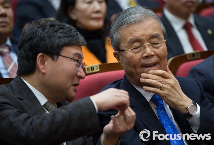 (서울=포커스뉴스) 김종인 더불어민주당 대표(오른쪽)가 16일 오후 서울 여의도 국회 의원회관에서 열린 '자영업자 정책연대 및 생존권 사수 출정식'에 참석해 이상직 의원과 대화하고 있다.