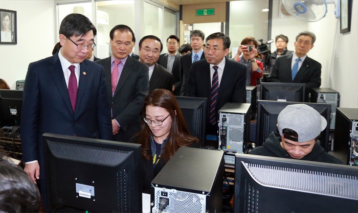 (서울=포커스뉴스) 이기권 고용노동부 장관이 15일 오후 서울 종로구 소재 MJC보석직업전문학교를 방문, 실습장에서 수업중인 학생들의 애로사항을 청취하고 있다. <사진게종=고용노동부>