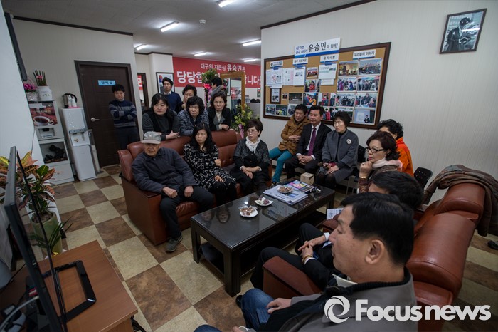 (대구=포커스뉴스) 새누리당이 유승민(대구 동구을) 의원에 대한 공천 배제안을 놓고 고민하고 있는 16일 오후 대구 동구 유 의원 선거사무소에 모인 지지자들이 뉴스를 시청 하고 있다.