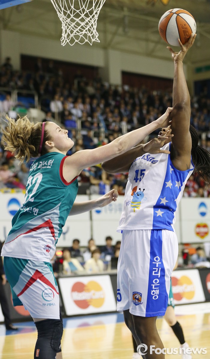 (춘천=포커스뉴스) 춘천호반체육관에서 열린 2015~2016 여자프로농구 우리은행-KEB하나 챔피언결정전 1차전에서 우리은행 굿렛이 KEB하나 리스턴의 블록을 피해 점프슛을 쏘고 있다.