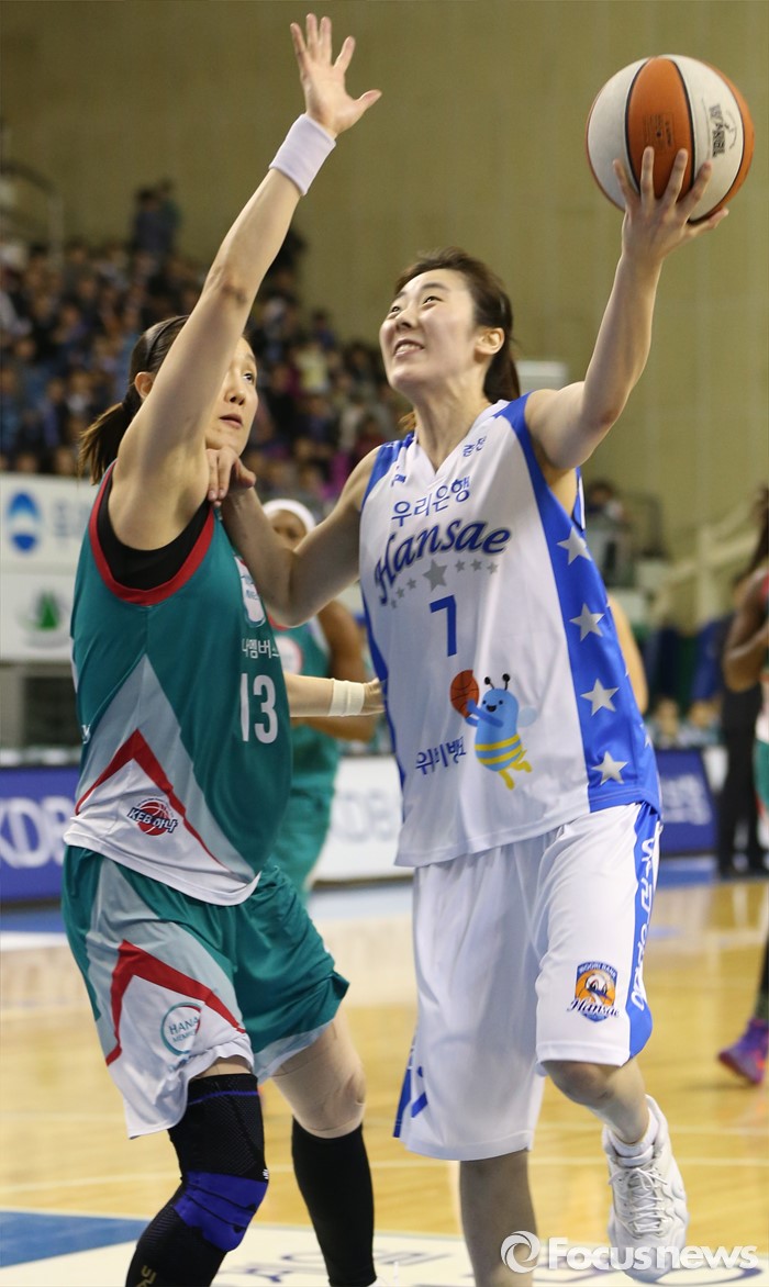 (춘천=포커스뉴스) 춘천호반체육관에서 열린 2015~2016 여자프로농구 우리은행-KEB하나 챔피언결정전 1차전에서 우리은행 박혜진이 KEB하나 김정은의 블록을 피해 레이업슛을 쏘고 있다.