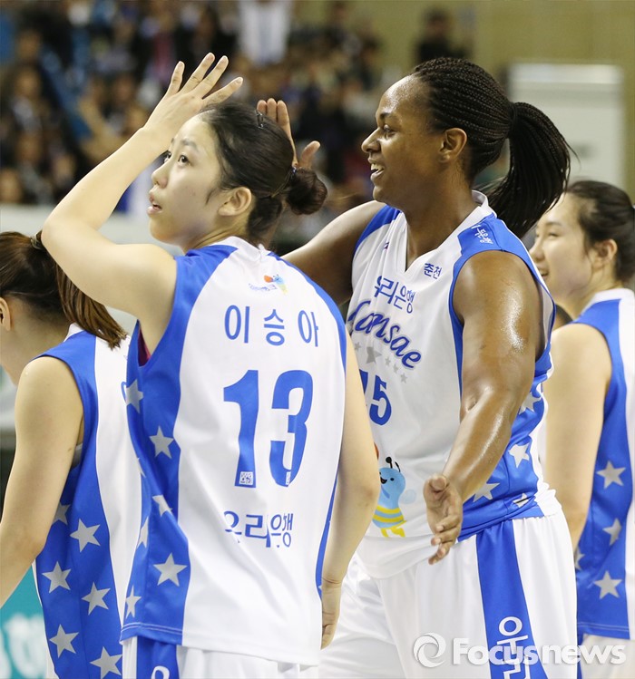 (춘천=포커스뉴스) 춘천호반체육관에서 열린 2015~2016 여자프로농구 우리은행-KEB하나 챔피언결정전 1차전에서 KEB하나를 물리친 우리은행 이승아와 굿렛이 하이파이브를 하고 있다.