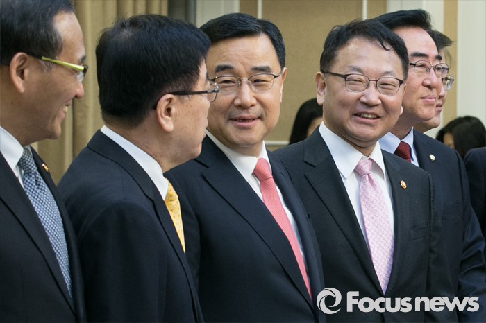 (서울=포커스뉴스) 김정훈(왼쪽 세번째) 새누리당 정책위의장과 유일호(왼쪽 네번째) 경제부총리 겸 기획재정부 장관이 17일 오전 서울 여의도 국회에서 열린 규제프리존특별법 제정을 위한 당정협의에 참석해, 기념사진 촬영 중 김광림(왼쪽 두번째) 의원과 대화하고 있다.