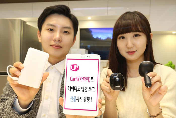 (서울=포커스뉴스) LG유플러스는 17일부터 LTE 라우터 ‘카파이(CarFi)’를 구매하는 고객에게 대용량 보조배터리와 USB 케이블을 증정하는 프로모션을 진행한다. 카파이는 어느 장소에서나 LTE신호를 와이파이로 만들어 주는 LTE 라우터로 사용자가 어디서든지 자유롭게 인터넷에 접속할 수 있도록 지원한다.