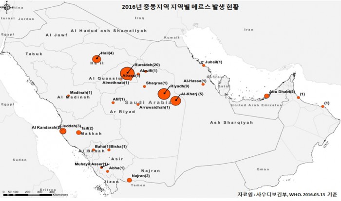 17일 사우디아라비아 보건부 등에 따르면 2016년 1월부터 현재까지 중동 호흡기질환 환자는 사우디아라비아 및 주변 국가(오만, 아랍에미리트) 에서 총 69명 발생했고, 이중 65명이 사우디아라비아에서 감염됐다.