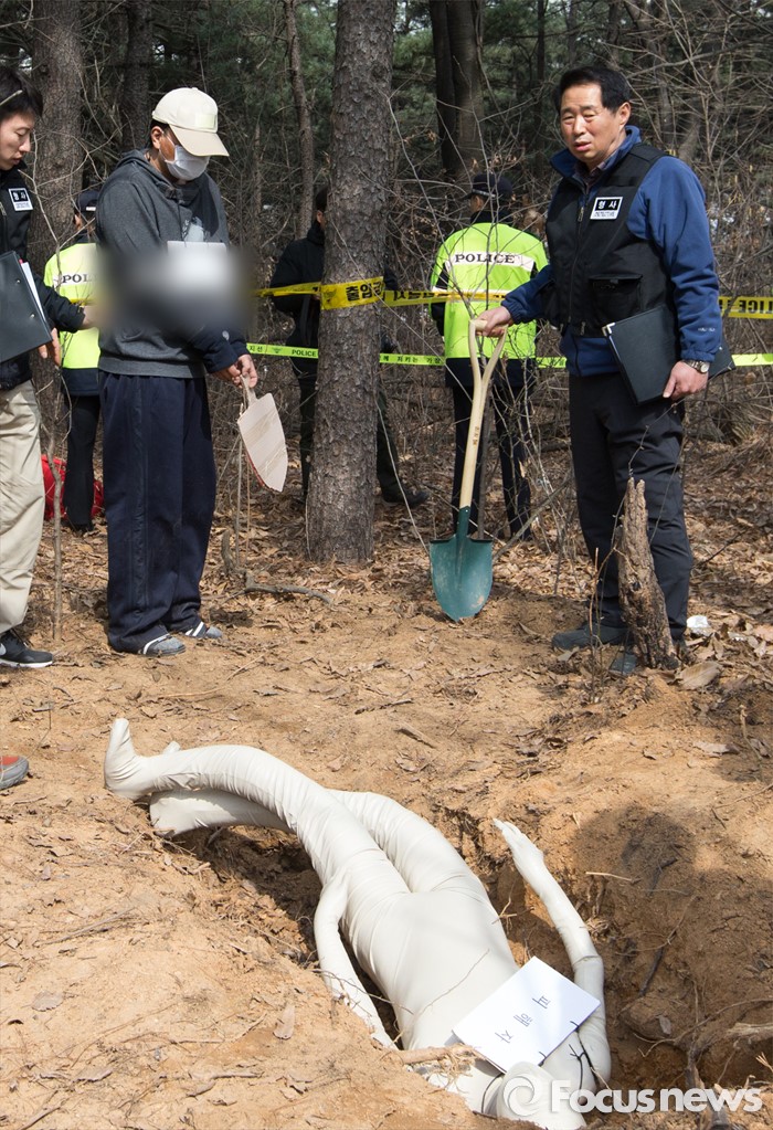 이씨는 산 중턱까지 차를 몰고 올라와 아버지 시신을 뒷자석에서 내려 15m 정도 이동 후 시신을 땅에 묻는 범행장면을 재연했다.