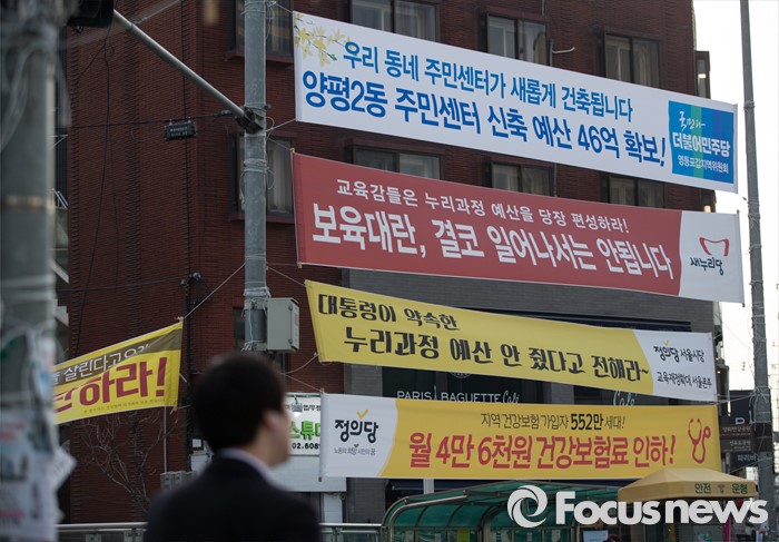 (서울=포커스뉴스) 17일 오전 서울 영등포구 선유도역 주변에 다양한 주제를 담고 있는 각 정당들의 정책 홍보 현수막이 걸려 있다.