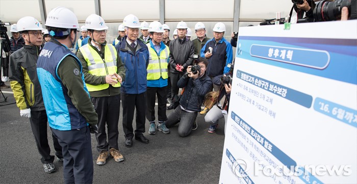 (서울=포커스뉴스) 박원순 서울시장이 17일 오전 서울 내부순환로 정릉천 고가에서 관계자의 설명을 들은 후 질문을 하고 있다.