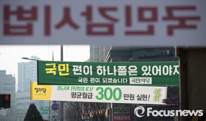 (서울=포커스뉴스) 17일 오후 서울 영등포구 당산역 주변에 다양한 주제를 담고 있는 각 정당들의 정책 홍보 현수막이 걸려 있다.