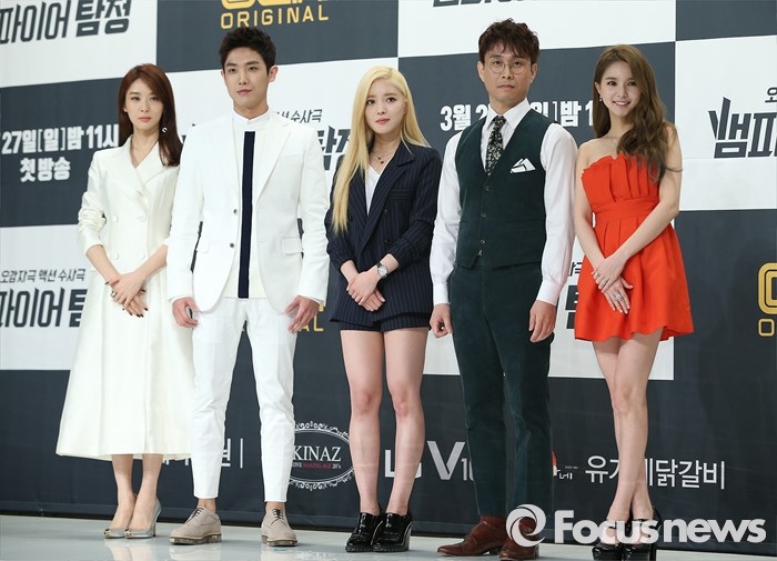 (서울=포커스뉴스) 17일 오후 서울 영등포구 타임스퀘어 아모리스홀에서 열린 OCN 드라마 '뱀파이어 탐정' 제작발표회에 참석한 배우 이청아(왼쪽부터), 이준, 이세영, 오정세, 재이가 포토타임 갖고 있다.