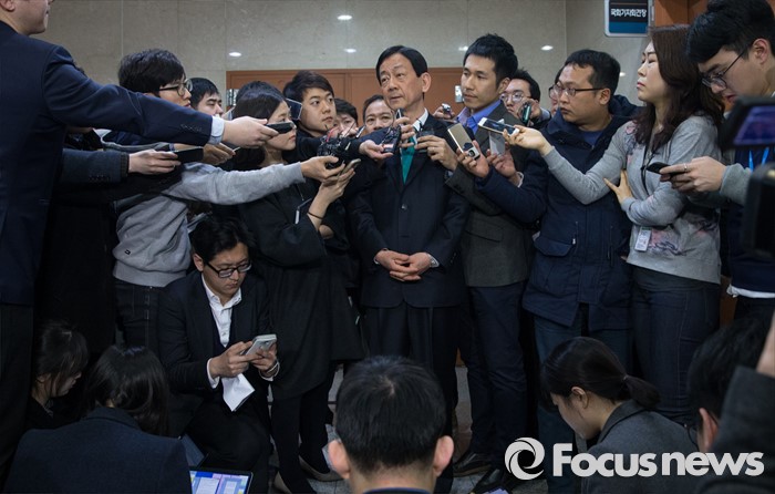 (서울=포커스뉴스) 공천에서 배제 된 새누리당 3선 중진 진영 의원이 17일 오후 서울 여의도 국회 정론관에서 탈당 기자회견을 마친 후 기자들의 질문을 받고 있다.