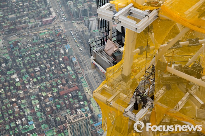 (서울=포커스뉴스) 17일 오후 서울 송파구 잠실 롯데월드타워가 최상층부의 첨탑 구조물 공사를 마치고 국내 최고 높이인 555m에 도달했다. 이날 공사 현장에서 인부들이 작업을 하고 있다.