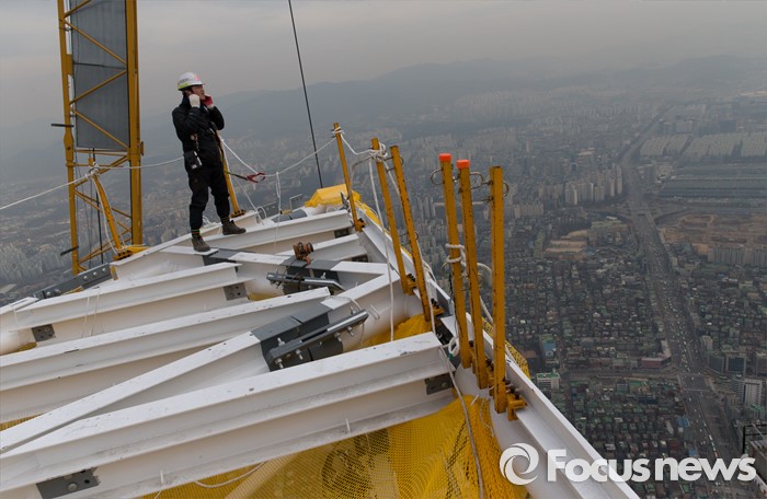 (서울=포커스뉴스) 17일 오후 서울 송파구 잠실 롯데월드타워가 최상층부의 첨탑 구조물 공사를 마치고 국내 최고 높이인 555m에 도달했다. 이날 공사 현장에서 인부들이 작업을 하고 있다.