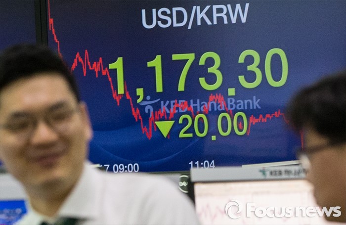 (서울=포커스뉴스) 17일 서울 중구 KEB외환은행 본점 딜링룸 전광판에 원달러환율이 전일 종가 대비 20원 내린 1173.3원를 나타내고 있다. 이날 코스피는 장중 2000선을 돌파했으며, 원·달러 환율은 전일 종가 대비 20원 내린 1173.3원으로 지난해 12월 30일(1172.5원) 이후 약 석달만에 종가 기준 1170원대를 기록했다.
