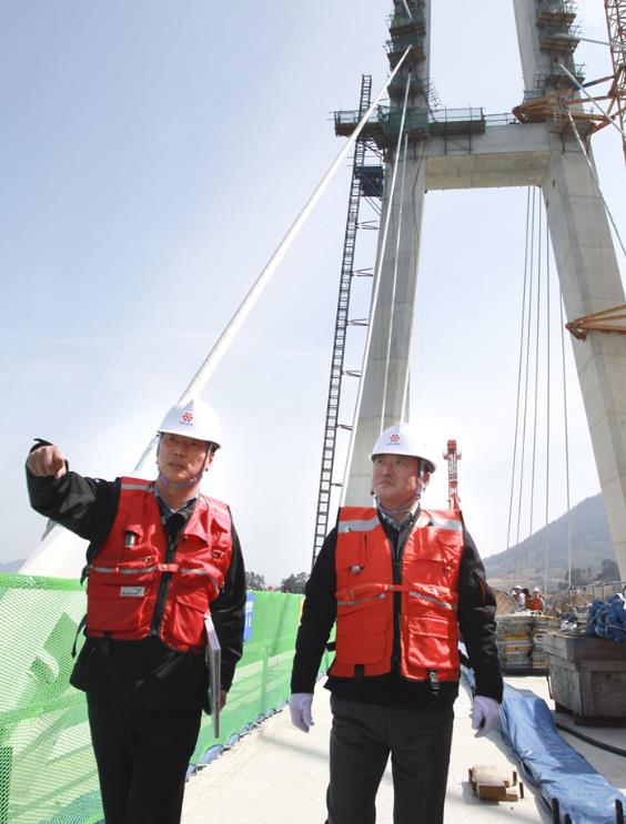 이날 전남 완도군 장보고대교 건설현장 방문에선 직접 배를 타고 공사 중인 교량의 30m 상공 상판으로 이동해 현장을 꼼꼼히 살피고 현장 직원들을 격려했다.