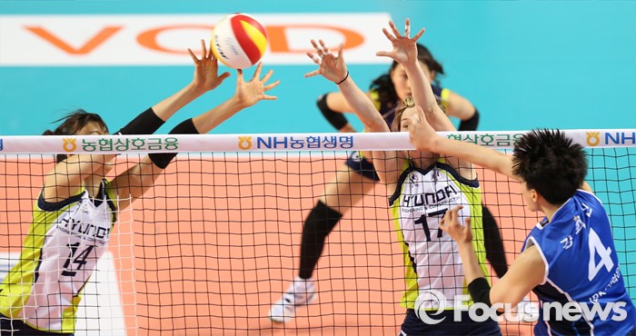 (화성=포커스뉴스) 17일 화성실내체육관에서 열린 2015-2016 V-리그 여자부 챔피언결정전 1차전 IBK기업은행-현대건설 경기에서 현대건설 양효진과 에밀리가 IBK기업은행 김희진의 스파이크를 블로킹으로 막고 있다.