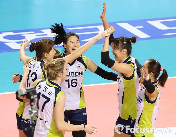 (화성=포커스뉴스) 17일 화성실내체육관에서 열린 2015-2016 V-리그 여자부 챔피언결정전 1차전에서 IBK기업은행을 물리치고 1승을 올린 현대건설 선수들리 코트에 모여 환호하고 있다.