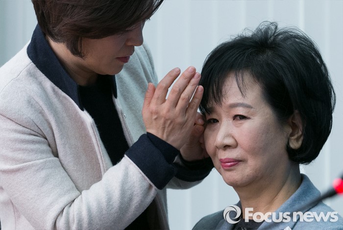 (서울=포커스뉴스) 공청 배제(컷오프)된 정청래 더불어민주당 의원의 선거구인 서울 마포을에 전략공천된 손혜원(오른쪽) 홍보위원장이 18일 오전 서울 여의도 국회에서 열린 기자간담회에 참석해 김종인 비대위 대표의 발표 후 눈물을 흘리자 진선미 선대위원이 위로하고 있다.
