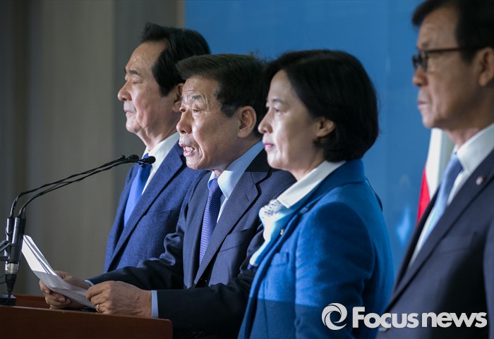 (서울=포커스뉴스) 더불어민주당 중진 의원들이 18일 오전 서울 여의도 국회 정론관에서 수도권 중심 야권 연대를 촉구하는 기자회견을 하고 있다. 왼쪽부터 정세균, 유인태, 추미애, 원혜영 의원.
