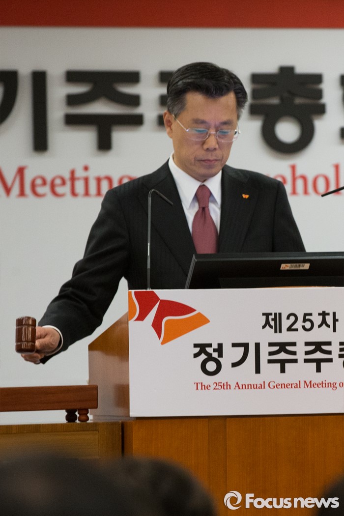 (서울=포커스뉴스) 조대식 사장이 18일 오전 서울 중구 SK본사에서 열린 제 25차 정기 주주총회에서 의사봉을 두드리고 있다. 이번 주총에서 최태원 SK그룹 회장의 등기이사 선임안건이 가결됐다.