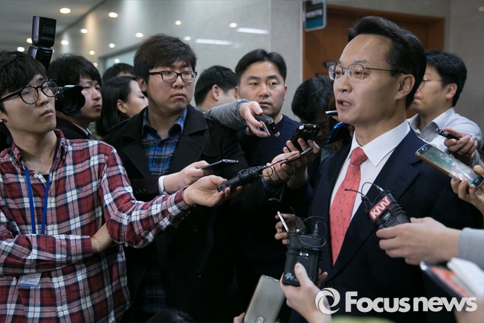 (서울=포커스뉴스) 공천 탈락한 조해진 새누리당 의원이 18일 오전 서울 여의도 국회 정론관에서 탈당 및 20대 총선 무소속 출마 기자회견을 마친 뒤 취재진 질문에 답하고 있다.