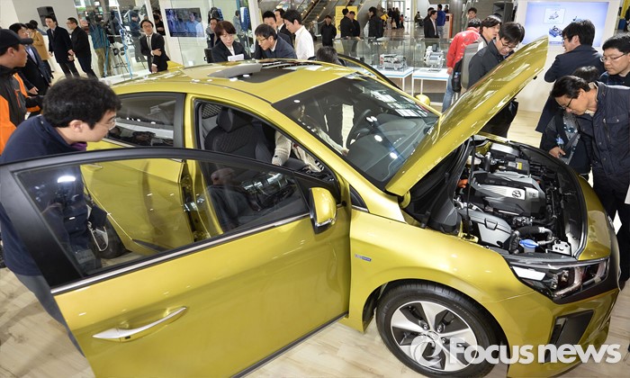 (제주=포커스뉴스) 18일 오전 제주 서귀포 제주국제컨벤션센터에서 열리고 있는 2016 국제전기자동차엑스포에서 관람객들이 현대 전기자동차 '아이오닉 일렉트릭'을 살펴보고 있다.