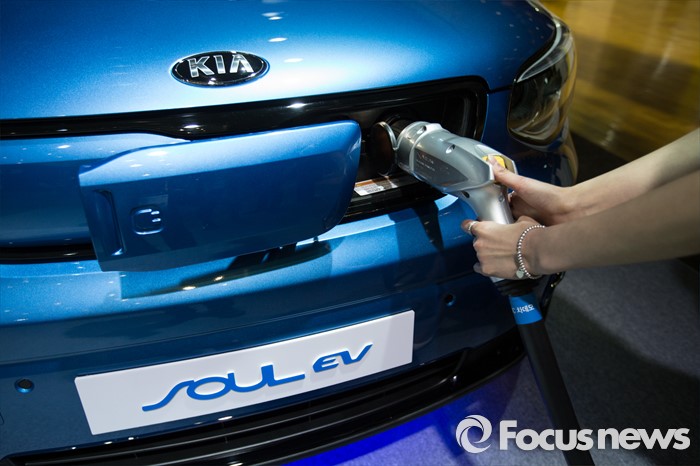 (제주=포커스뉴스) 18일 오전 제주 서귀포 제주국제컨벤션센터에서 열리고 있는 2016 국제전기자동차엑스포에서 기아 전기자동차 '소울'의 충전 모습