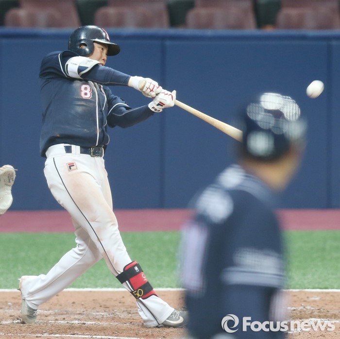 (서울=포커스뉴스) 18일 서울 고척스카이돔에서 열린 2016 프로야구 시범경기 5회초 무사 2루에서 두산 류지혁이 우중간 2루타를 날리고 있다.