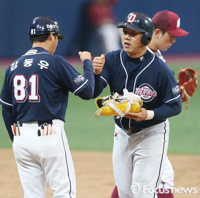 (서울=포커스뉴스) 18일 서울 고척스카이돔에서 열린 2016 프로야구 시범경기 5회초 두산 선두타자 이우성이 좌익수 왼쪽에 떨어지는 2루타를 치고 강동우 코치와 주먹을 마주치고 있다.