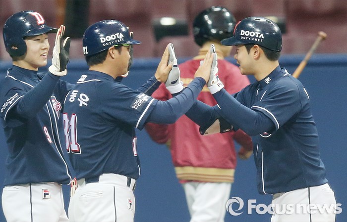 (서울=포커스뉴스) 18일 서울 고척스카이돔에서 열린 2016 프로야구 시범경기 두산-넥센 경기 7회 무사 2루에서 두산 서예일이 우월 2점 홈런을 치고 강동우 코치와 선행주자 조수행의 환영을 받으며 홈인하고 있다.