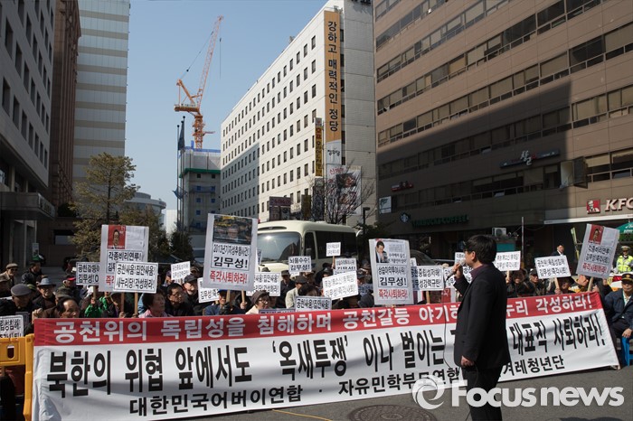 (서울=포커스뉴스) 18일 오후 서울 영등포구 새누리당사 앞에서 어버이연합을 비롯한 보수단체 회원들이 '북한의 위협 앞에서도 옥새투쟁 등을 벌이는 김무성 대표의 사퇴를 촉구하는 기자회견'을 하고 있다.
