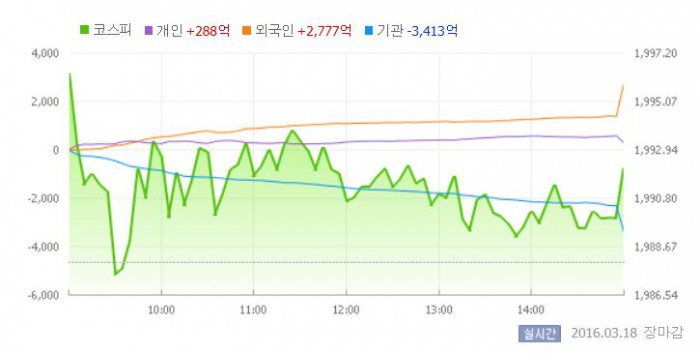 18일 코스피지수는 전일 대비 0.21%(4.13포인트) 오른 1992.12에 장을 마쳤다. 코스피가 종가 기준으로 1990선을 넘어선 것은 지난해 12월 24일 이후 처음이다.