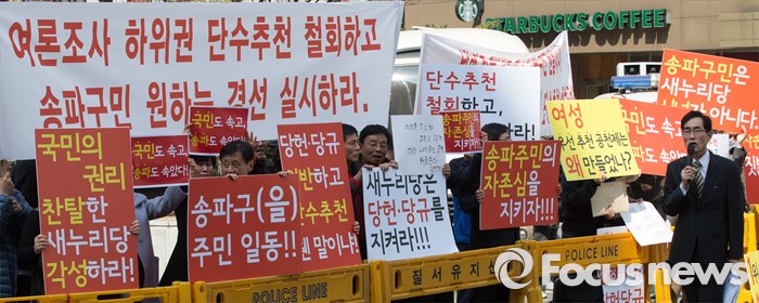 (서울=포커스뉴스) 18일 오후 서울 영등포구 새누리당사 앞에서 송파구(을) 주민들이 여론조사 하위권 단수추천 철회 및 송파구민이 원하는 경선 실시를 촉구하고 있다.