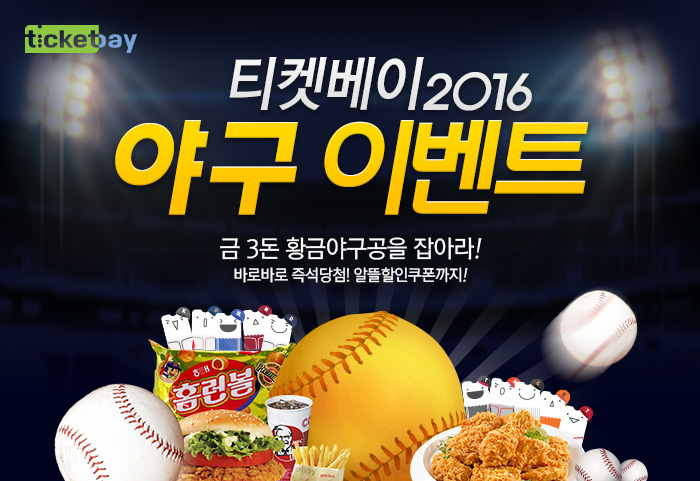 티켓베이는 이번 이벤트를 통해서 다양한 경품과 알뜰 쿠폰을 제공한다. 먼저 로그인 후 이벤트 페이지에 있는 'START' 버튼을 클릭하면 즉석에서 경품 당첨 여부를 확인할 수 있다. 또한 해당 이벤트에 참여한 회원들을 대상으로 추첨을 통해 금 3돈으로 만들어진 황금 야구공을 경품으로 제공한다.