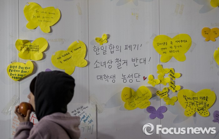 (서울=포커스뉴스) 18일 오전 서울 종로구 일본대사관 앞에서 열린 '한일 위안부 합의 폐기, 소녀상 철거 반대 대학생 100인 농성'에 참석한 학생이 위안부 피해자를 향한 응원의 문구들 앞에서 사과를 먹고 있다.
