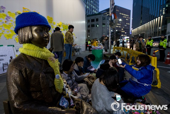 (서울=포커스뉴스) 18일 오전 서울 종로구 일본대사관 앞에서 열린 '한일 위안부 합의 폐기, 소녀상 철거 반대 대학생 100인 농성'에 참석한 학생들이 소녀상 곁을 지키고 있다.