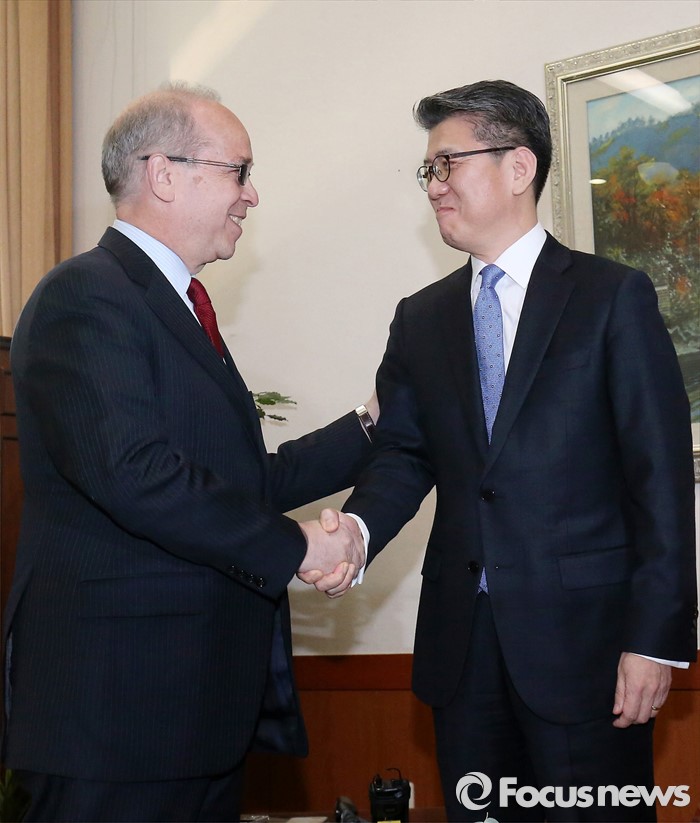 외교부는 "미국 측에서는 국무부 이외에 재무부 및 상무부 제재 담당관들도 협의에 참석한다"며 "대북제재 행정명령을 비롯한 미국의 대북제재 정책 전반에 대한 심도있는 논의를 하게 될 것으로 기대된다"고 전했다.김홍균 외교부 차관보가 지난달 26일 오후 서울 종로구 외교부에서 대니얼 러셀(왼쪽) 미 국무부 동아태 차관보와 만나 악수하고 있다. 2016.02.26 양지웅 기자