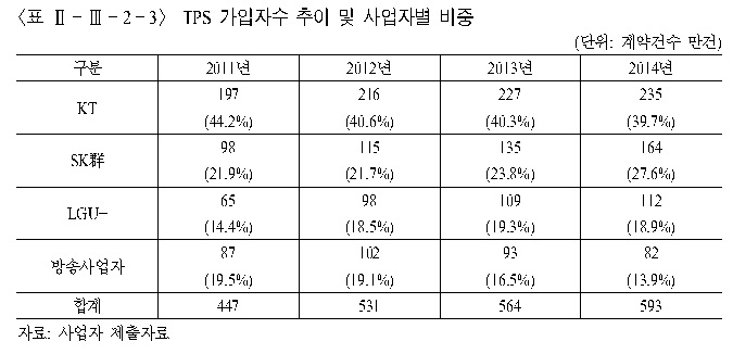 18일 정보통신정책연구원(KISDI)이 공개한 ‘통신시장 경쟁상황 평가 보고서’에 따르면 2014년 TPS 가입자는 2014년 전년(564만명) 대비 약 5.1% 증가한 593만명을 기록했다.