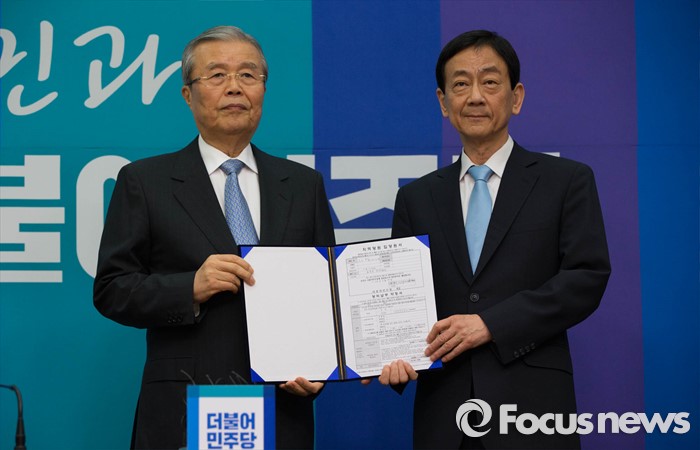 (서울=포커스뉴스) 새누리당에서 공천 배제된 뒤 탈당한 진영 의원이 20일 오전 서울 여의도 국회에서 더불어민주당 공식 입당을 알리는 기자회견을 열고 김종인 비대위 대표와 함께 입당원서를 들어 보이고 있다