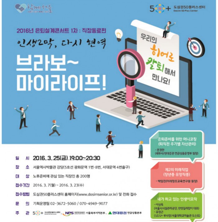 이성은 서울시 인생이모작지원과장은 "2016 은퇴설계콘서트가 퇴직을 앞둔 직장인들의 답답함을 시원하게 뚫릴 수 있기를 기대한다"며 "앞으로도 더욱 다채로운 프로그램과 서비스로 장년층들의 인생후반부 역전에 기여하겠다"고 밝혔다.<사진출처=도심권50플러스센터 홈페이지>
