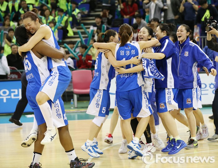 (부천=포커스뉴스) 20일 부천체육관에서 열린 2015-2016 여자프로농구 챔피언결정전 3차전을 승리하며 3승으로 우승을 차지한 우리은행 선수들이 얼싸 안으며 우승의 감격을 만끽하고 있다.