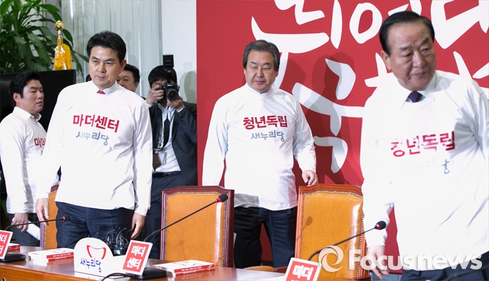 (서울=포커스뉴스) 김무성(오른쪽 두번째) 새누리당 대표를 비롯한 최고위원들이 21일 오전 서울 여의도 국회에서 열린 최고위원회의에 참석하고 있다. 오른쪽부터 서청원 최고위원, 김 대표, 김태호 최고위원, 원유철 원내대표.