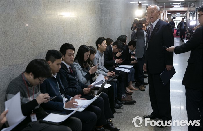 (서울=포커스뉴스) 21일 오전 서울 여의도 국회 더불어민주당 대표회의실 앞에서 선진규 전 중앙당 노인위원장이 20대 총선 비례대표 후보자 선발과 관련 취재진에게 설명하고 있다. '셀프 공천' 논란을 받고 있는 김종인 비대위 대표는 이날 진행된 비공개 회의에 불참했다.