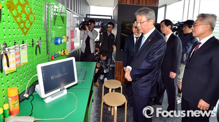 (서울=포커스뉴스) 임종룡(가운데) 금융위원장이 21일 오전 서울 종로구 더케이트윈타워에서 열린 '인터넷은행 현장간담회'에 참석해 아이디어룸을 살펴보고 있다.