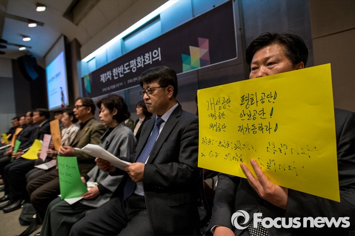(서울=포커스뉴스) 21일 오전 서울 중구 프레스센터 국제회의장에서 열린 '제1차 한반도평화회의'에 참석한 종교계와 시민단체 관계자들이 남북간 무력시위 중단 및 개성공단 재가동을 촉구 하고 있다.
