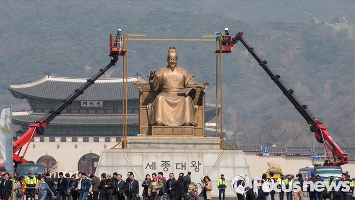 (서울=포커스뉴스) 21일 오전 서울 광화문 광장 세종대왕상에 한ㆍ불수교 130주년 기념 미술작품 '킹 오브 사인스'가 설치되고 있다.