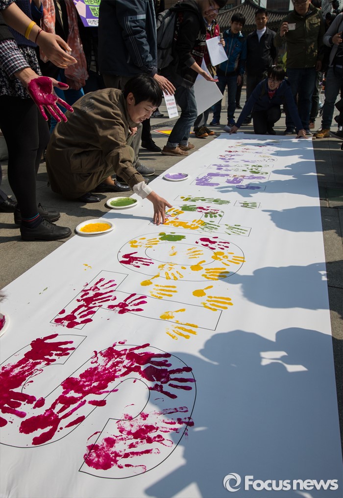 (서울=포커스뉴스) 21일 오전 서울 광화문 광장에서 열린 '세계인종차별철폐의 날 맞이 제 이주 인권 노동 사회단체 국제연대 공동 기자회견'에서 참석자들이 'STOP RACISM'(인종차별 금지)가 적힌 현수막에 손도장을 찍고 있다.