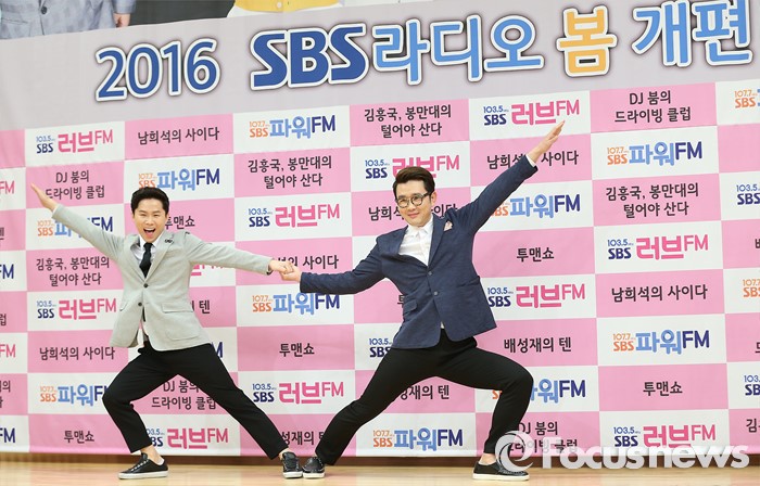 (서울-포커스뉴스) 21일 오후 서울 SBS 목동사옥에서 열린 SBS 라디오 봄 개편 기자간담회에 참석한 개그맨 양세형(왼쪽)과 윤형빈이 포토타임을 갖고 있다.