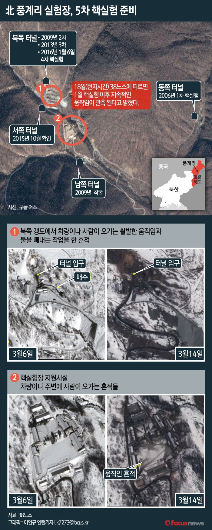 (서울=포커스뉴스) 18일(현지시간) 미국 존스홉킨스대 한미연구소가 운영하는 북한 전문 사이트 38노스는 풍계리 실험장의 "3월 위성사진을 보면 지난 1월 핵실험을 진행한 북쪽 갱도에서 활발한 움직임과 더불어 물을 빼내는 작업을 한 흔적이 보인다"며 추가 핵실험이 진행될 가능성이 있다는 분석이 나왔다.