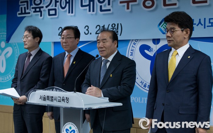 (서울=포커스뉴스) 21일 오후 서울특별시교육청에서 장휘국(오른쪽 두번째) 전국시도교육감협의회 회장이 교육감 탄압 중단 성명서를 발표하고 있다. 왼쪽부터 조희연 서울교육감, 민병희 강원교육감, 장휘국 광주교육감, 이청연 인천교육감.